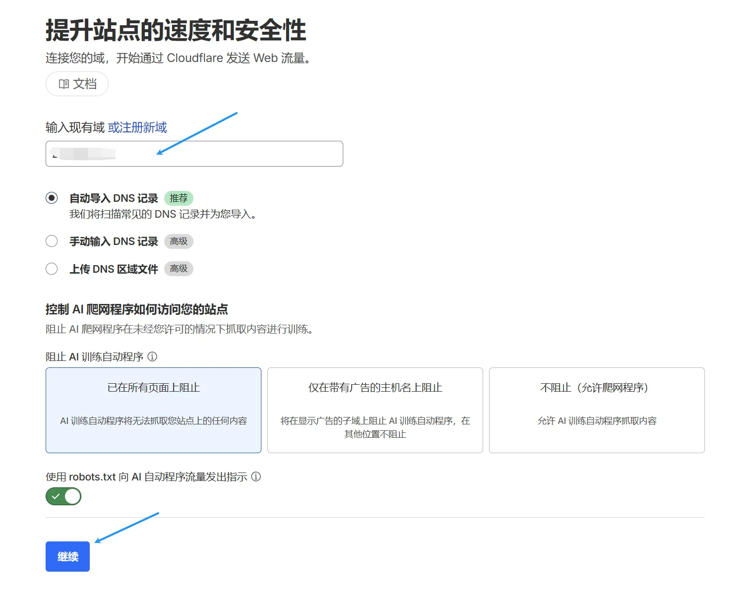 输入你要托管的域名,然后点击继续