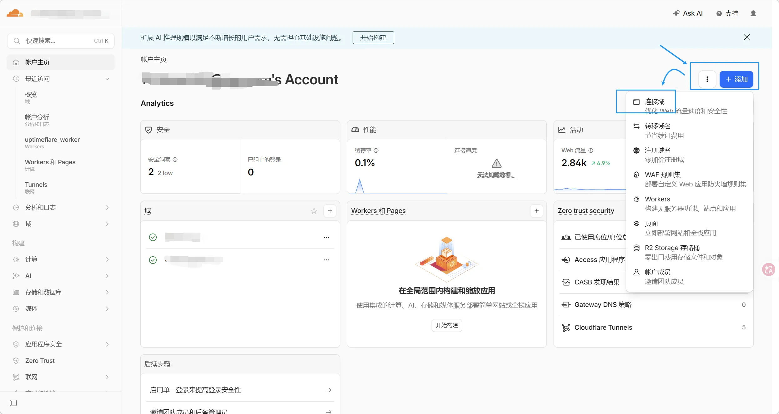 进入cloudflare首页,右上角,链接→添加域