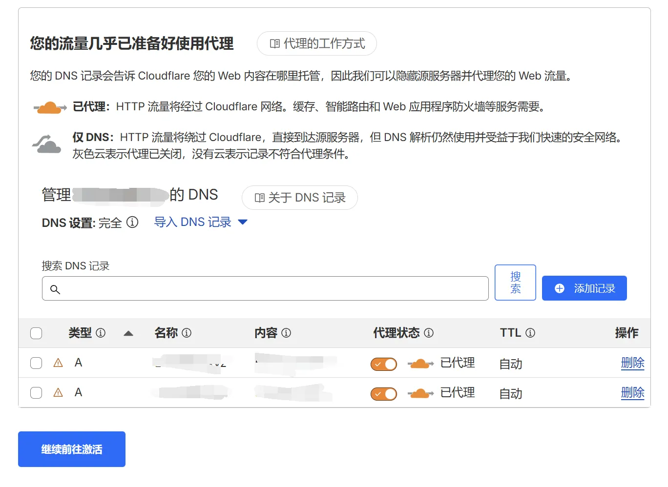 Cloudflare会自动扫描你的DNS记录,点击继续前往激活